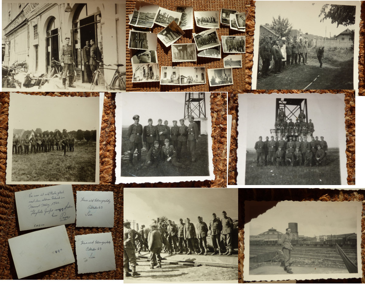 Occupation allemande! Photo Gare avec Panneau "Eingang für Wehrmacht" et soldats, env. 1942. Plus 14 Photos du Soldat Josef Neumaier, 1940 - env. 1943. Plus: "Kurs auf Übungsplatz, Oktober 43, Siss." (Sissonne), soldats allemands e pylône, 2 photos 6x6cm. Et photo 6x9cm, "Da war ich auf Wache .. März 1944" (2x soldats en face d'un batiment).