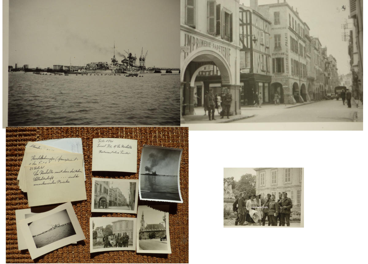 Inscriptions au verso des photos: "Kriegsschiff im Feuer auf der Überfahrt v. La Rochelle nach der Insel Re, 25.Juli 41" (Le Scharnhorst bombardée fume),"Scharnhorst 1941", "Deutsches Schlachtschiff den 25. Juli 41, La Rochelle", "25. Juli 41, La Rochelle mit deutschem Schlachtschiff … und der amerikanischen Brücke" (Scharnhorst), "Handelsdampfer (französisch) v.den Deutschen versenkt (Schlagseite), La Rochelle d. 25. Juli 41", "Juli 1941, Insel Re b. La Rochelle, Restaurant ohne Fenster" (Café Rest. Deluteau avec des soldats), 2x "25.Juli 41, Straße mit Arkaden", "Fischereihafen 25. Juli 41", "Turm 25. Juli", "abends am 25. Juli", "altes Stadttor 25.7.", "Rathaus", soldats et femmes, "Kammergrab, Soldatenheim", soldats.