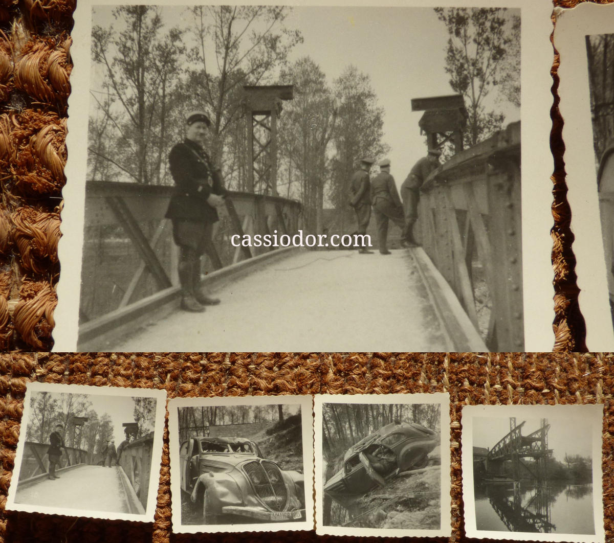 Peugeot 202, accident, 5 photos 6x6cm, vers 1941. On voit 2 morts dans la voiture (WH 1168880), und pont demi-détruit, des soldats allemands et un flic francais. Verso sans inscriptions mais avec le numéro tamponné "360".