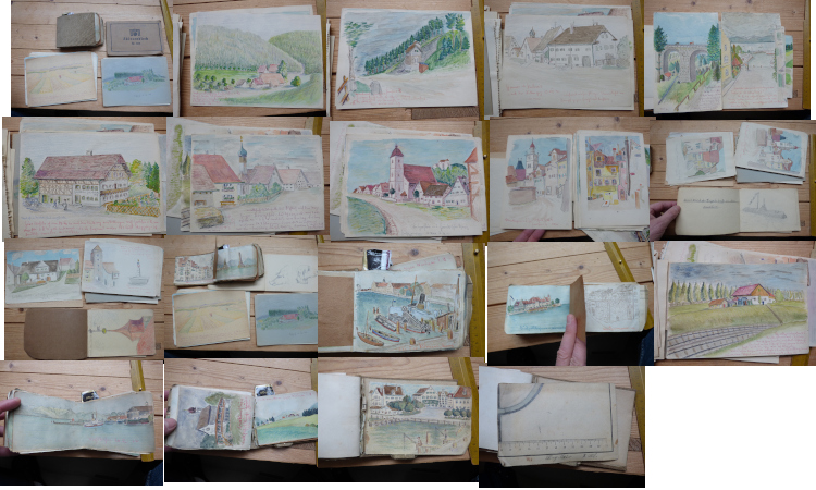 3. 42 aquarellierte Zeichnungen, ca. 15x20cm, gefertigt meist im August 1940. Die Bilder sind alle von Hand betitelt und datiert und lokalisiert, dazu schrieb Mair oft Bemerkungen zum Kriegsgeschehen am jeweiligen Tag, sowie (ganz vereinzelt) autobiographische Begebenheiten. Mair lebte in Hausen a Rottweil. Teils zeichnet er “nach der Natur”, teils wohl nach Photographien. Blick von der Anhöhe Weghausen u. R. Nac.. [unles.] gegen Osten, 26.8.40, Hintergrund Schwäbische Alb / Dauchingen bei Schwenningen / Villingen Schwarzwald / Wimpfen / Dinkelsbühl / Überlingen a Bodensee / Alte Mühle bei Ellwangen / Betzenheim in d fränkischen Schweiz / Unterhohenried in Unterfranken / Bad Hals bei Passau / Leutkirch / Wallfahrtskapelle bei Fischbach auf dem … Königsfeld / Schrankenwärterposten 45 Strecke Oberreitnau-Lindau / Oberhalbstein / Rottweil a Neckar vom Wäldchen aus / Niedereschach / „alte Mühle am Eingang des Gladbachs in Burgberg bei Königsfeld bad. Schwarzwald. 19.viii.40. Engländer verlor 147, wir verloren 36 Flugzeuge. Neu bearb. 3.x.41” / „Gasthaus z Nordstetter Hof. Wirt ist in Wirklichkeit noch dicker. Hier kehrte ich am 14.viii.40 auf dem Rückweg von Dillingen nach Hausen v R ein. 6 Kw [?] gab bekannt: 13.viii England verlor 132 Flugzeuge, 28 Deutsche werden vermißt.” / Burgberg bei Königsfeld bad. Schwarzwald. “Tagestour mit Mutter u. Marianne, 31.VIII.40. Bericht vom Vortag: Engl. verloren 98, wir 34 Flugzeuge. London hatte durch 24 Stunden 7 mal Fliegeralarm. Nacht 30-31 bewarfen sie Innen-Berlin mit Brand- und Sprengbomben.” / Hoher Turm Rottweil / Rottweil, Hohe Brücke / “Aussicht aus unserem Wohnzimmer, Lindau B. Adolf-Hitler-Platz 1, 21.X.41, während unsere Truppen das Donez-Becken erobern und die U-Boote versenkten tüchtig. Orte in Norddeutschland wurden von Fliegern bombardiert.” Dazu 16 Bilder, die Szenen in und um Hausen zeigen: Unterrodenheim bei Hausen / Gutshof Wildenstein 12.8.40 / an der Eschach beim Wehr, Badeplatz u. Steg / Straßenbild von Hausen ob Rottweil / Gasthaus Adler / Friedhof / Lehrgut / “Das Haus der Eltern unserer Milchfahrin” / Schulhaus Rathaus / Steinbruch / Nachbar Schlenker, auf dem Brett Schulkinder während Pause / Gasthof z. Hasen / Haus des Bürgermeisters / Schulhaus Rathaus / Straße nach Hergen, Eingang in den Wald und Beginn des langen Abstiegs, Aussicht auf Hochschwarzwald, 10.9.1941.