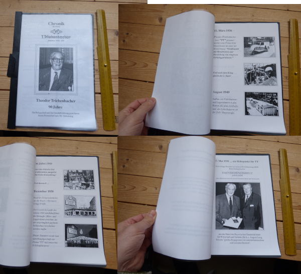 Chronik der Firma T. Triebenbacher, München 1936-1991, ca. 15 kopierte Blatt, aus dem Nachlass eines ehemaligen Mitarbeiters. Theodor Triebenbacher gründete 1936 einen Großhandel für Metallwaren, später Vorhangstangen, dann Schmiedeeisen aller Art. Man erwarb Grundstücke Ecke Bayer / Hermann-Lingg-Straße, Sendlingerstraße, Rüdesheimerstraße. 2020 fusionierte man mit der „Sommer Group“ aus Kirchheim/Teck.