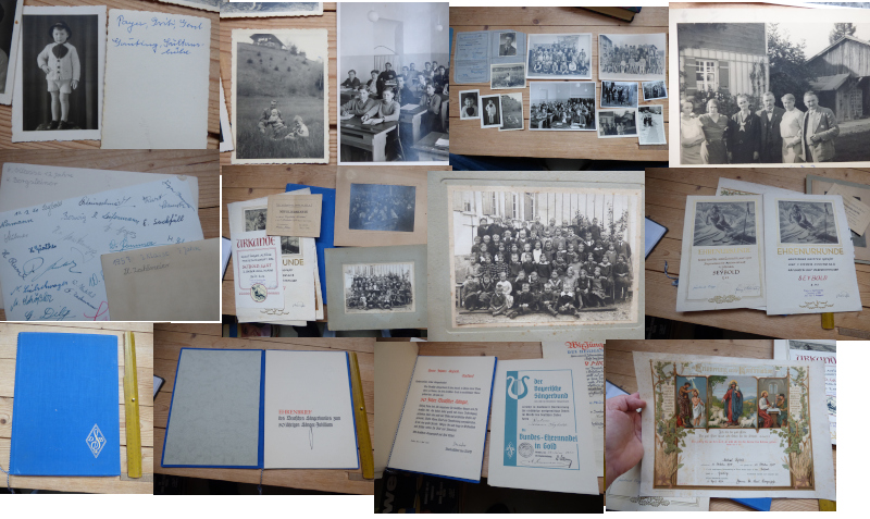 7: Ca. 10 s-w-Abzüge differenter Formate, gezeigt meist Gerd: Ostern 1940 / um 1942 mit Papa und Schwester unter Haus Sultanshöhe, Gauting [wohl Blick auf Haus am Höhenweg nahe dem Ort, an dem 1925 die Kulisse des indischen Tempels für den Film „Die Liebe der Bajadere“ errichtet wurde – woran der Straßenname „Sultanshöhe“ erinnert] / am Ostufer des Starnberger Sees 1942-43 / Winter 46-47 mit Skiern / Klassenfoto 1951 / Führerschein 1957. Dazu 2 Klassenfotos von einem 1950 geborenen Menschen (der nicht aus Gauting stammenden Gattin?) / Papa mit Familie am Haus Höhenweg?, 1933.