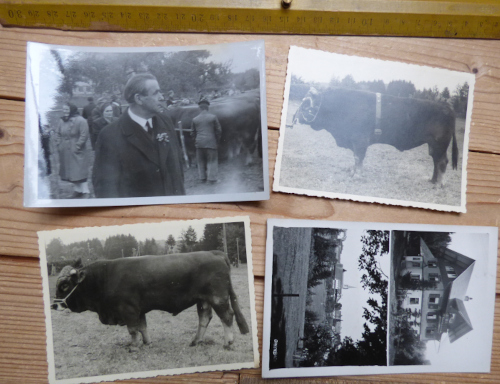 Der Rinderbaron, 3 Fotos um 1950, gezeigt Ochsen und ein Mann mit Zigarre. Die Bilder dürften anlässlich eines Viehmarktes aufgenommen worden sein. Dazu eine AK, gezeigt ein Einfamilienhaus in Opfenbach, die sich in einem Nachlass mit den Bildern in einem Umschlag fand.