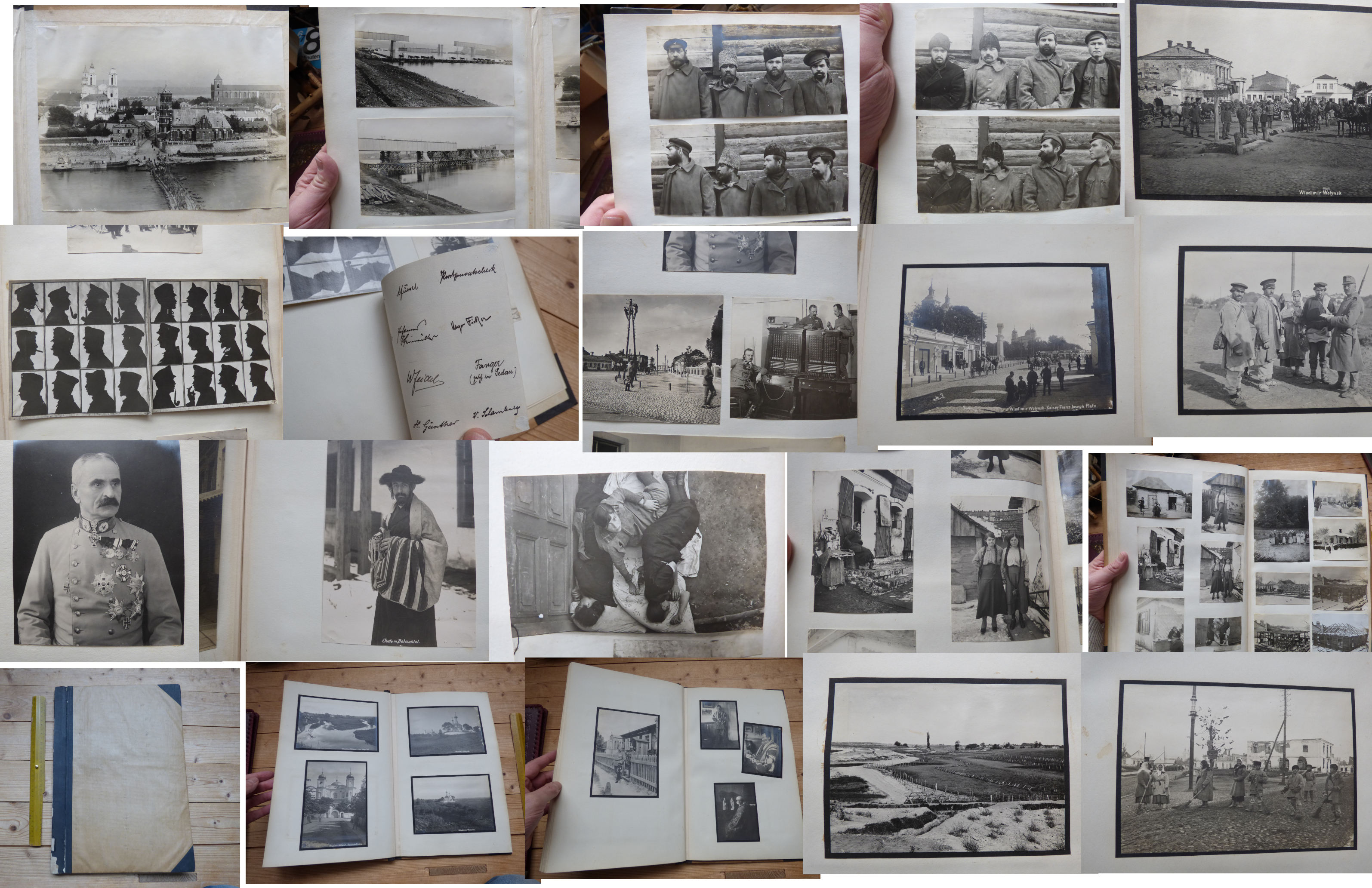 Auf der Rückseite zweier Abzüge (die partiell gelockert und so biegbar sind), welche im Scherenschnitt die Umrisss der Köpfe deutscher Soldaten zeigen, stehen handschr. Personennamen, bei einem steht „jetzt in Sedan“ - was auf eine Mann verweist, der von der Ostfront an die Westfront versetzt wurde. Die auf anderen Bilder gezeigten Soldaten sind zumeist österreichisch-ungarischer Truppenzugehörigkeit.