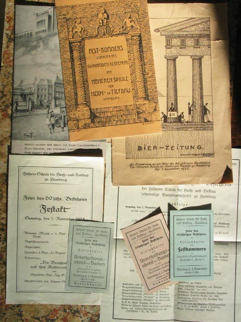 - Fest-Kommers der Höheren Schule für Hoch- und Tiefbau in Hamburg zur Feier des 65jährigen Bestehens der Hochbauschule und des 25jährigen Bestehens der Tiefbauschule am 1.11.1930 (8°, 21 Seiten, dünner Okart., leicht berieben, sonst gut). Abgedruckt ist ein gereimter langer humoriger Text.