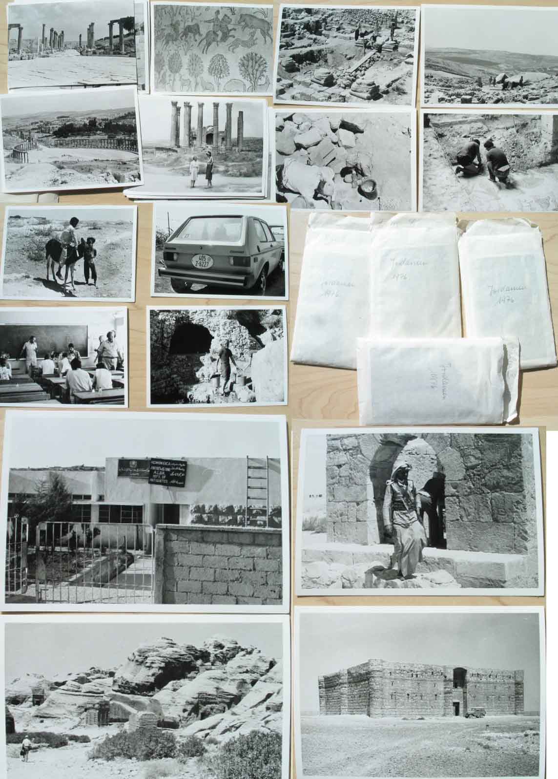 Gezeigt sind: Petra (ca. 29 Abzüge), antike Ruinenstadt mit Theater, Mosaik (ca. 16x, wohl Gerasa), mittelalterliche Festung in der Wüste, teils mit einheimischem Führer (6x), Ölbaum (ca. 6x), Grabung und Umgebung, Archäologen (Hesbon?, 18x), VW Rabbit / Golf mit deutschem Kennzeichen (2x), Tiere (3x), Archäologen in Klassenzimmer (1x), Heshbon EXCA Andrews Uni, ACOR, Dept. of Antiquities (1x).